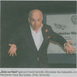 Es sind die großen Gefühle, die der quirlige Altmeister des Kabaretts, Horst Schroth, auf die Bühne bringt. Als Unternehmensberater Nikolaus Niehoff wühlte er in seinem neuen Programm "Grün vor Neid" mit Hingabe in den geheimen Fächern des Giftschranks von "lieben" Verwandten und Freunden. Ohne Umwege machte er seinem ungezügelten Zorn im Herchener Haus des Gastes Luft. Wegen Mandy, dem angeheirateten Miststück, war es bei der Testamentseröffnung nach Tante Elsbeths Tod zum Eklat um eine Hutschenreuther-Tasse gekommen. Die Tasse hatte die Flucht aus Ostpreußen überstanden, die Testamentseröffnung überlebt sie nicht. Anklagend, wie ein Fanal für einen Mord, hielt Schroth dem Publikum die zerbrochene Tasse entgegen, die er Mandy an den Kopf geknallt hatte. Warum ist es nicht möglich, dem anderen etwas zu gönnen? Schroth holte weit aus, denn angefangen hatten die Begehrlichkeiten bei Adam und Eva, die deshalb aus dem Paradies geflogen waren. Akribisch vermaß Schroth den überall vorhandenen Neidfaktor in seiner Umgebung. Dazu nahm er eine Zuschauerin aus der ersten Reihe ins Visier und vermutete bei ihr sündhaft teure italienische Stiefel und eine Cartier-Uhr. Auf einer Skala von eins bis zehn erweckt der Senf aus Bautzen keinen Neid, wobei ein Lamborghini volle Punktzahl einfährt. Wie ein tonnenschwerer schwarzer Ball im Innern, geschützt mit Stacheldraht, läuft unentwegt das Vergleichsprogramm im Hirn. Selbst vor Kindern macht es keinen Halt. Der Sohn seines Neffen Jonas kann noch nicht lesen, aber die Initialen von Edelmarken kennt er genau. "Seine Anspruchsliste ist lang wie ein Güterzug", empört sich Schroth über Kindergeburtstage mit Delfinschwimmen und Klassenreisen nach San Francisco.